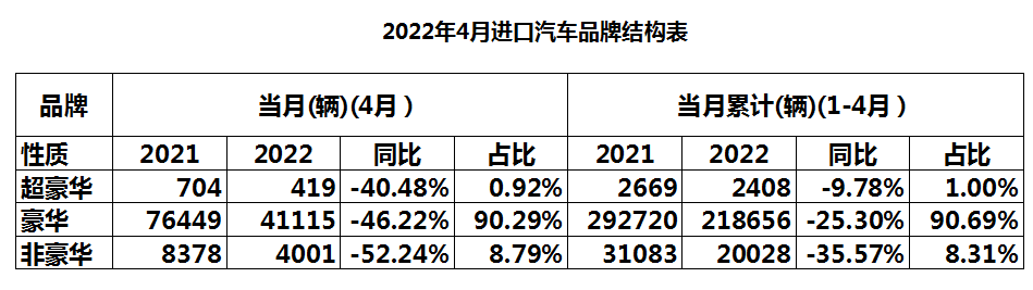 品牌結(jié)構(gòu)方面,進口汽車市場銷量整體大幅下滑。2022年4月超豪華車、豪華車和非豪華汽車同比均下降50%左右,反映出防疫封閉對車市的整體影響 。其中非豪華車受疫情影響最大,同比下降35.57%,超豪華車降幅遠低于市場整體水平,同比下滑9.78%。