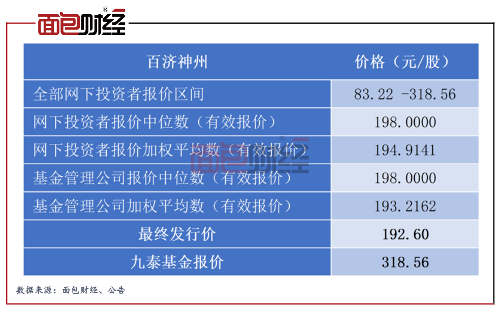 因百濟神州將擬申購價格高于 234.50 元/股的配售對象全部剔除,九泰基金在本次IPO中無法參與網(wǎng)下申購。數(shù)據(jù)顯示,進入百濟神州有效報價的基金公司報價中位數(shù)、加權(quán)平均數(shù)均不足200元/股,九泰基金的每股報價高于行業(yè)平均逾100元。