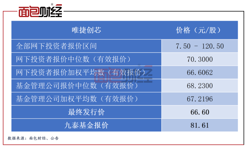 資料顯示,唯捷創(chuàng)芯初步詢價收到的報價區(qū)間為7.50元/股-120.50 元/股,其中網(wǎng)下全部投資者的報價加權(quán)平均數(shù)為66.61元/股、基金管理公司的報價加權(quán)平均數(shù)為67.22元/股,九泰基金的報價顯著高于平均水平。