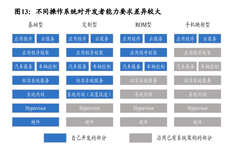 如今的車載操作系統(tǒng)市場(chǎng)百家爭(zhēng)鳴:黑莓、微軟、安卓等廠商提供基礎(chǔ)型的操作系統(tǒng),大部分車企與開發(fā)者在此基礎(chǔ)上進(jìn)行有限定制化的開發(fā),不涉及系統(tǒng)內(nèi)核的修改,如基于Andriod的奔馳MBUX、寶馬iDrive、大眾MIB、比亞迪DiLink、蔚來NIO OS等ROM型操作系統(tǒng)。而類似于特斯拉version、大眾VW.OS、華為鴻蒙OS等難度更高的定制型獨(dú)立操作系統(tǒng),需要在基礎(chǔ)型操作系統(tǒng)上進(jìn)行深度開發(fā)。