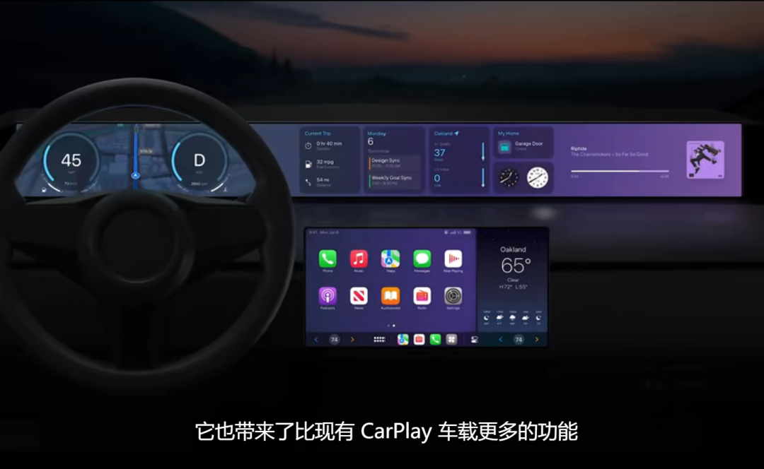 當(dāng)然,蘋果的野心不止于此。在本次WWDC上,蘋果展示出了一套能接管整個(gè)車機(jī)系統(tǒng),控制車內(nèi)所有屏幕的全新CarPlay。雖然蘋果的造車計(jì)劃在傳言中磕磕絆絆命運(yùn)多舛,但蘋果絲毫不掩飾“一統(tǒng)天下車機(jī)”的野心。