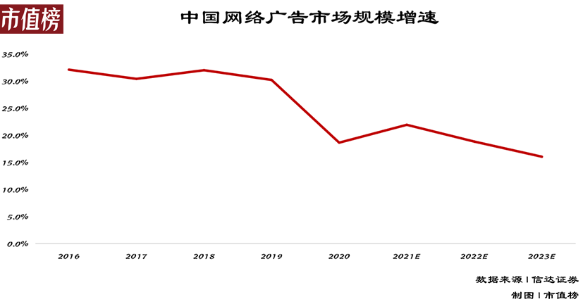 如上圖所示,2020年以后,中國網(wǎng)絡(luò)廣告的市場規(guī)模增速呈現(xiàn)出明顯下滑趨勢,從前幾年30%的高速增長,切換到低速增長模式。