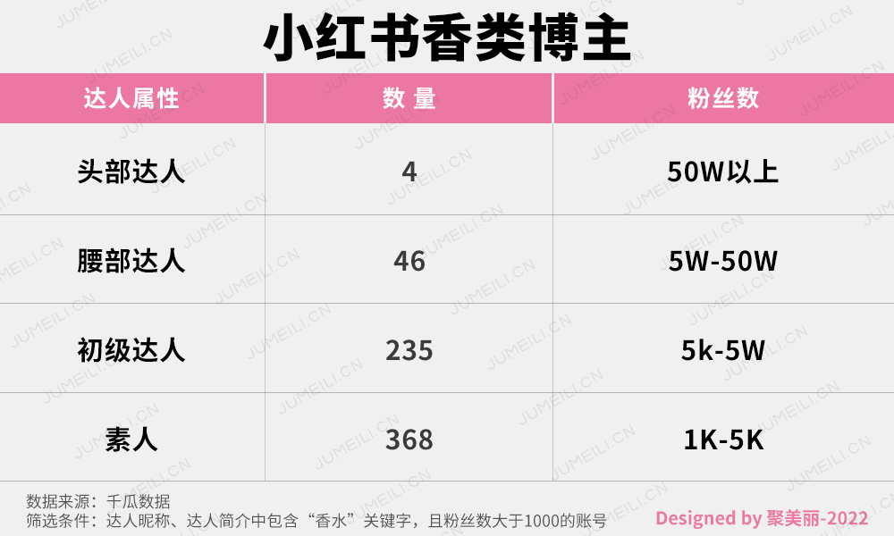 并且,通過數(shù)據(jù)我們發(fā)現(xiàn),與動輒上百萬級別的美妝博主相比,粉絲數(shù)在5W以上的賬號,在香類博主領(lǐng)域就已算得上“小有體量”,更多是集中在萬粉以下級別的賬號。