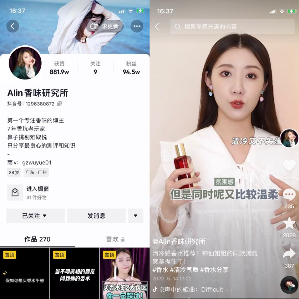 出生于廣州的Alin是一位擁有500萬粉絲的美妝博主,出于嘗試的目的,發(fā)布了幾期關(guān)于香水的內(nèi)容后,發(fā)現(xiàn)反饋特別好,感興趣的人也很多。