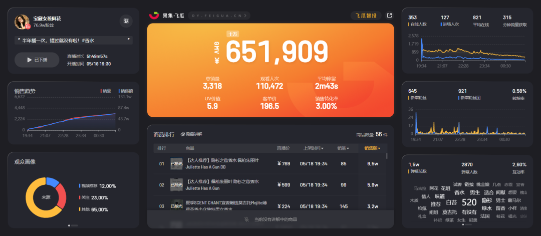 其中,該場銷量最高的2個SKU,為抖音平臺中香水品牌店播做得比較好的佩槍朱麗葉,2個客單價在599-769的香水產(chǎn)品中,共得到約12.4W的銷售額,整場5小時的直播時長中,共計65.2W的銷售額。
