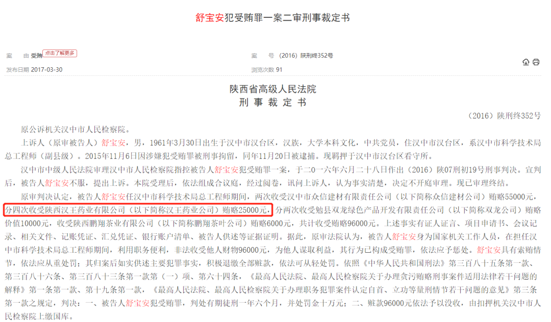 值得注意的是,其主打產(chǎn)品強(qiáng)力定眩系列的“誕生”曾有黑歷史。裁判文書網(wǎng)的一份2016年的刑事裁定判決認(rèn)定,2013年漢王藥業(yè)申報(bào)的陜西省“強(qiáng)力定眩膠囊”工藝優(yōu)化科技項(xiàng)目、2014年申報(bào)的陜西省天麻山茱萸新產(chǎn)品創(chuàng)新開(kāi)發(fā)項(xiàng)目中,被告人舒寶安任漢中市科學(xué)技術(shù)局總工程師期間,分四次收受漢王藥業(yè)賄賂25000元。