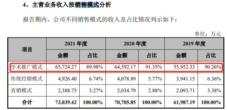 漢王藥業(yè)的產(chǎn)品銷售主要采取“經(jīng)銷+直銷”模式,而其主要銷售方式是“學(xué)術(shù)推廣”。2019年-2021年,該模式下?tīng)I(yíng)業(yè)收入分別占當(dāng)期主營(yíng)業(yè)務(wù)收入的比例為 90.26%、91.35%和 89.98%。