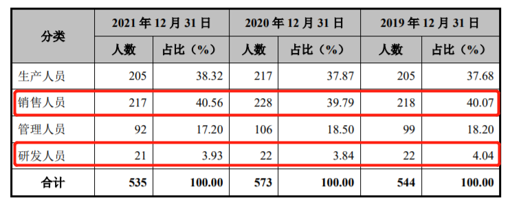 對(duì)比在銷售上的大額投入,漢王藥業(yè)的研發(fā)投入明顯不足。以2021年為例,銷售人員217人,研發(fā)人員21人,分別占比40.56%、3.93%。
