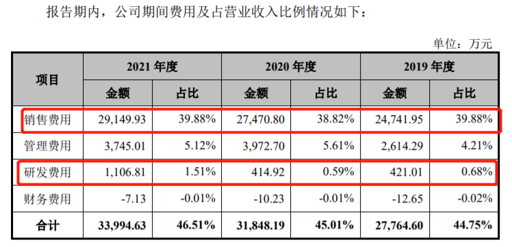 2021年銷售費(fèi)用為2.91億元,而當(dāng)年研發(fā)費(fèi)用只有1106萬(wàn),分別占營(yíng)業(yè)收入比例為39.8%、1.51%。