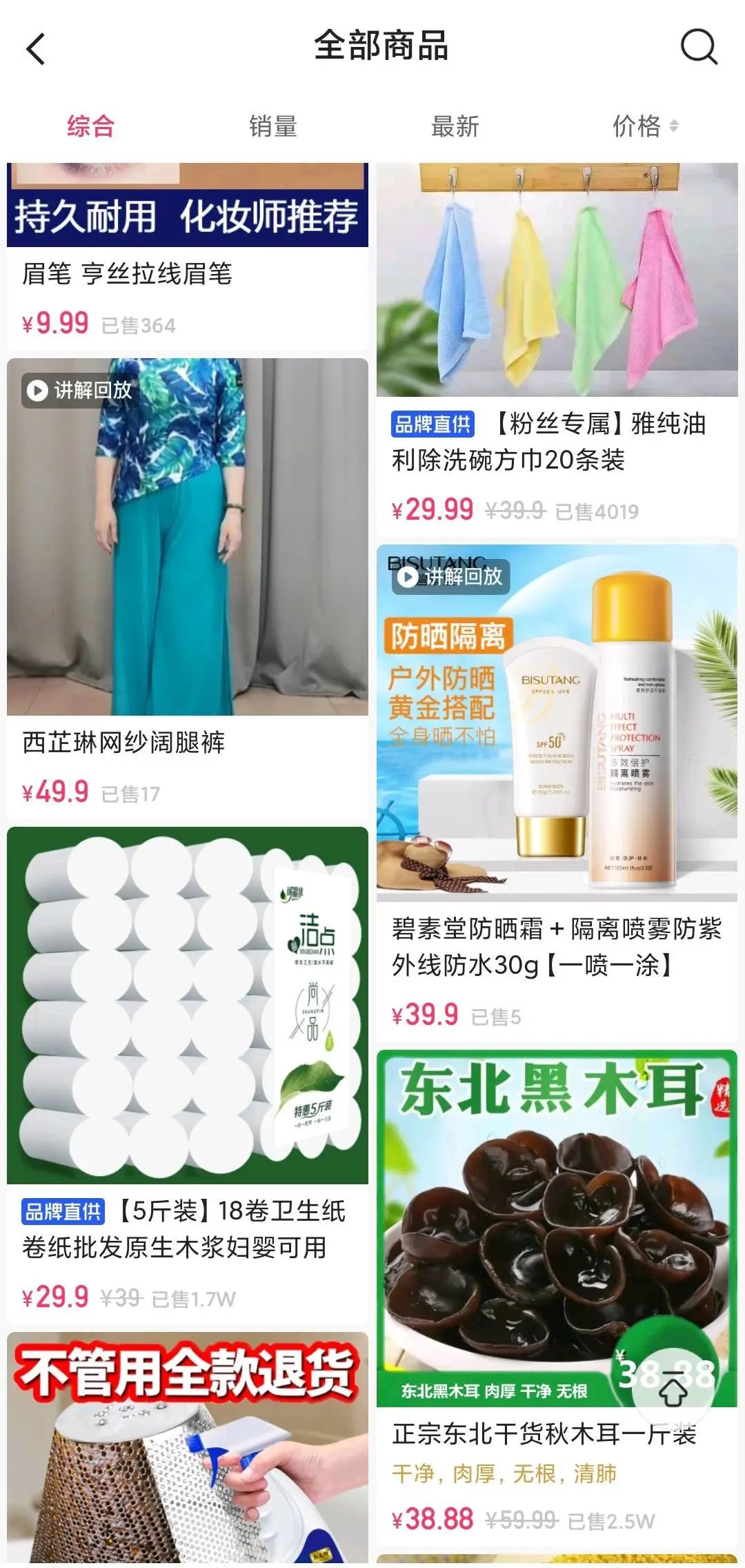 通過(guò)查看媽媽關(guān)注的幾個(gè)教廣場(chǎng)舞的直播間賬號(hào)后,我發(fā)現(xiàn)店鋪商品除了服飾,就是日用品和保健品居多。但無(wú)一例外,基本看不到家喻戶曉的品牌,更多是一些雜牌貨。