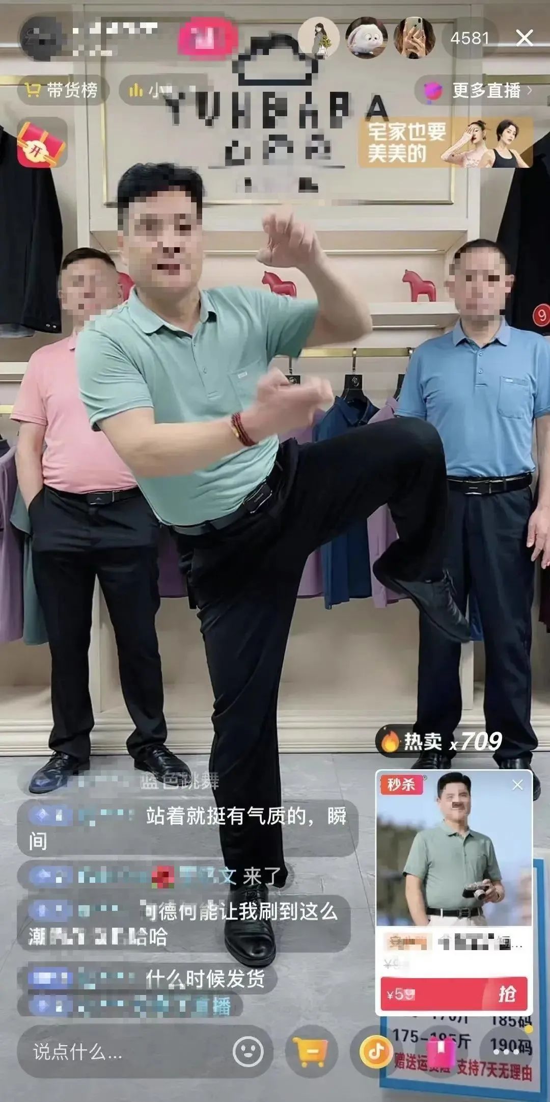更震撼我的,是這群中年主播毫不扭捏,邊自信的擺pose邊介紹身上穿的衣服、褲子,甚至還有一位主播現(xiàn)場(chǎng)打起了套拳。不少網(wǎng)友在評(píng)論區(qū)表示,“像極了我爸手舞足蹈的樣子”。而我不僅全程看直播看得津津有味,還在主播打完拳后“激情下單”了他穿的那條褲子。
