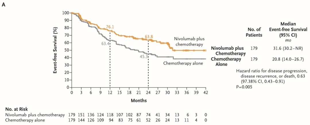 在患者至少隨訪21個(gè)月的基礎(chǔ)上,研究顯示,接受納武利尤單抗聯(lián)合化療方案治療的患者中位EFS為31.6個(gè)月(95%CI,30.2~未達(dá)到),接受化療治療的患者中位EFS為20.8個(gè)月(95%CI,14.0~26.7),兩組患者疾病進(jìn)展、疾病復(fù)發(fā)或死亡的風(fēng)險(xiǎn)比(HR)為0.63(97.38%CI,0.43~0.91;P=0.005)。