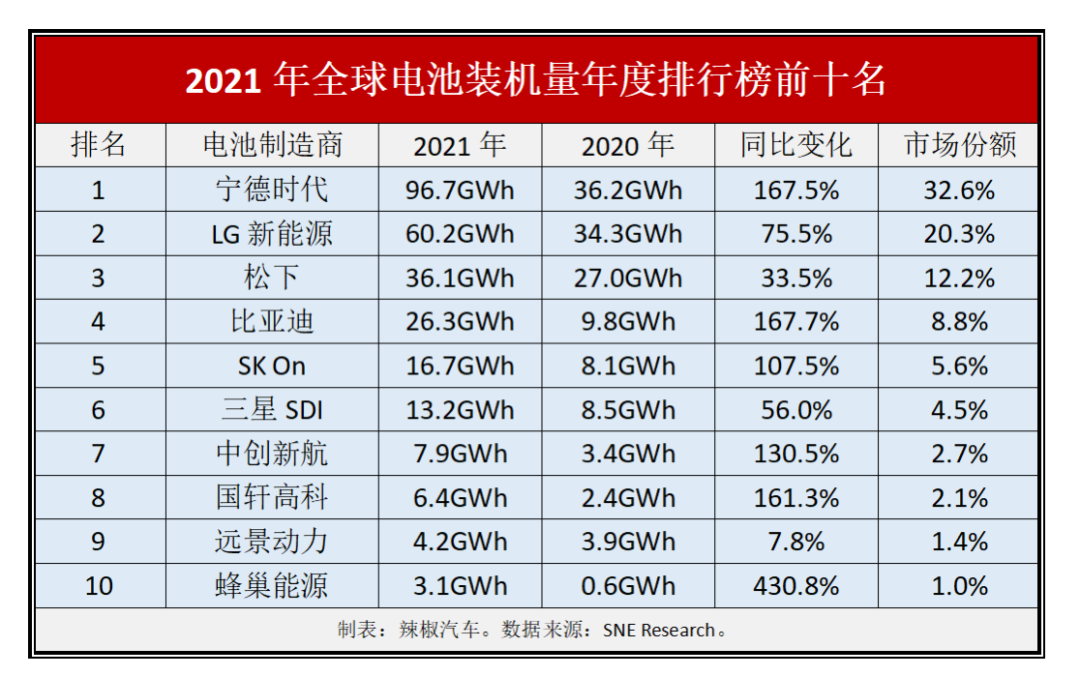 根據(jù)韓國(guó)市場(chǎng)研究機(jī)構(gòu)SNE Research公布的數(shù)據(jù),2021年,全球動(dòng)力電池前十大巨頭中,中國(guó)品牌多達(dá)六家。