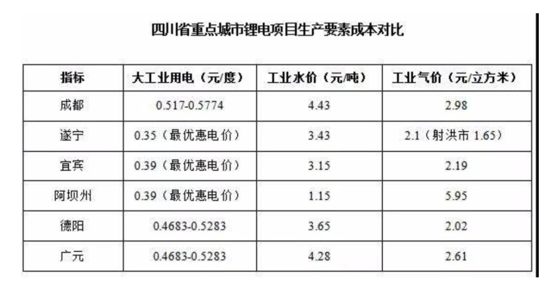 據(jù)高工鋰電統(tǒng)計(jì),目前四川省重點(diǎn)城市在大工業(yè)用電、工業(yè)水價(jià)、工業(yè)起價(jià)等方面均給出了相當(dāng)大的優(yōu)惠力度。