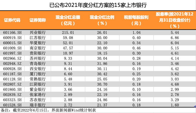 其中,興業(yè)銀行的年度現(xiàn)金分紅總額最高,達(dá)215.01億元,稅前每股股利同樣最高,為1.04元。股息率方面(按2021年12月31日收盤價(jià)計(jì),下同),江蘇銀行最高,為6.86%;現(xiàn)金分紅比例最高的為青島銀行,達(dá)31.86%。