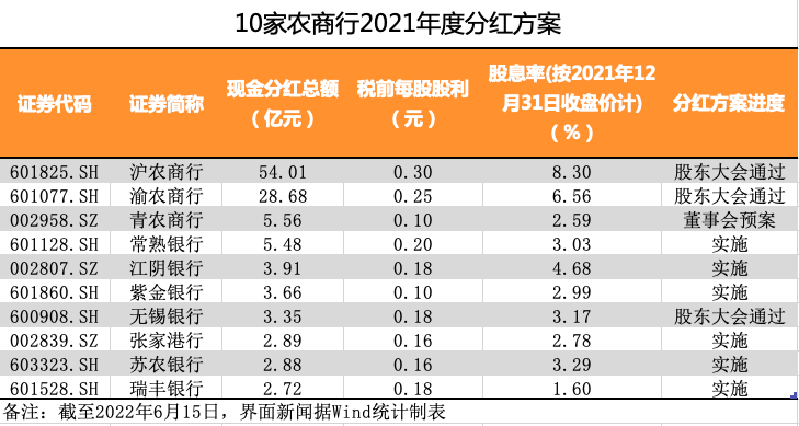 農(nóng)商行方面,10家銀行現(xiàn)金分紅共計(jì)113.14億元,占上市銀行現(xiàn)金分紅總額比例的2.1%。其中,滬農(nóng)商行的現(xiàn)金分紅總額、稅前每股股利和股息率均拔得頭籌,分別為54.01億元、0.3元和8.3%。