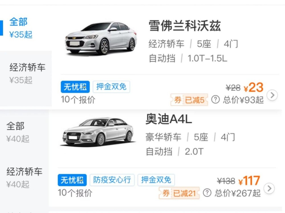 談擎說AI編輯部的文文同學(xué),前兩天租車去參加大學(xué)室友婚禮,那天看到價(jià)格文文還跟我們吹自己揀著漏了,因?yàn)樗麑?shí)際租到的21款?yuàn)W迪A4L,只要不到120元一天,加上保險(xiǎn)服務(wù)費(fèi)一天也才270元。