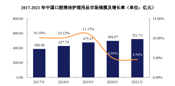 2017年到2021年,我國(guó)口腔清潔護(hù)理用品行業(yè)市場(chǎng)規(guī)模從388億增長(zhǎng)至522億,年復(fù)合增長(zhǎng)率7.65%,但2020年和2021年,行業(yè)增速分別只有4.94%和4.56%。