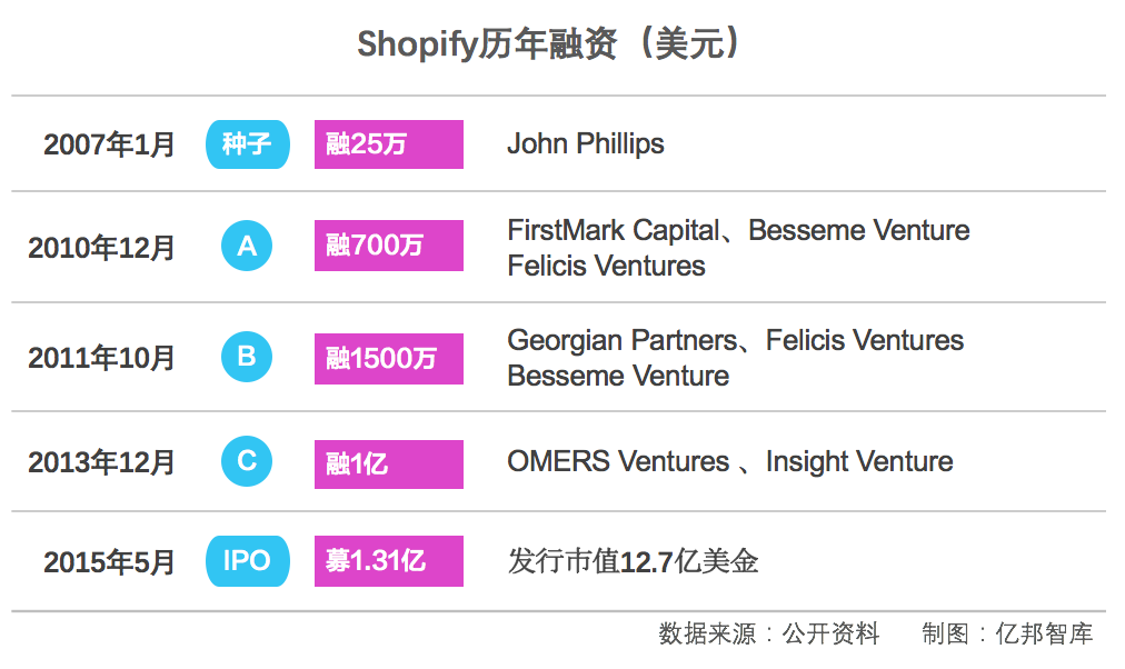 亮眼的業(yè)務(wù)增長,讓Shopify先后拿到柏尚投資(Besseme)、Georgian Partners等機(jī)構(gòu)兩輪總計(jì)2200元美元投資。資本加持下,圍繞中小商戶建站需求和開店的支付、物流、營銷需求,Shopify開始擴(kuò)大服務(wù)產(chǎn)品,并于2014年?duì)I收突破1億美元大關(guān)。