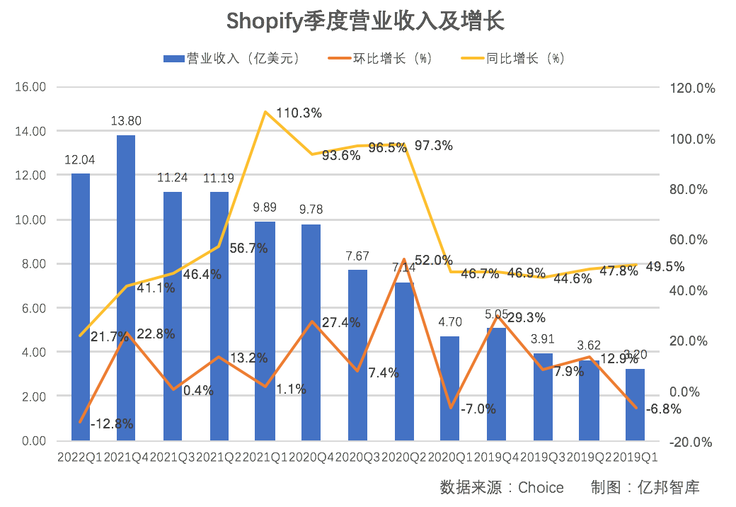 2022年一季度Shopify實(shí)現(xiàn)營收12億美元,環(huán)比下降12.78%;同比增長22%,增速較疫情前下降超一半。疫情前,2019年連續(xù)四個(gè)季度,Shopify營收增速均在40%以上。事實(shí)上,從2021年四季度開始,Shopify的營收同比增速就開始低于疫情前,疫情帶來的業(yè)績提前透支影響開始顯現(xiàn)。