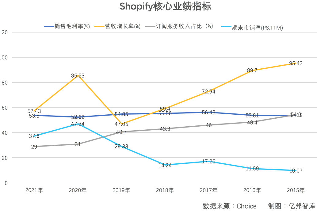 2021年,亞馬遜GMV6000億美元,營收4698億美元,其中產(chǎn)品銷售營收2418億美元,服務(wù)業(yè)務(wù)營收2280億美元,凈利潤334億美元;ShopifyGMV1754億美元,營收46億美元,凈利潤29億美元。