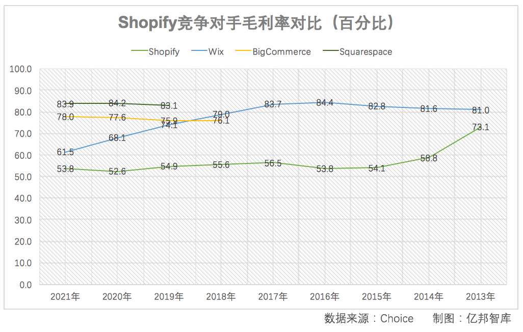 毛利率方面,過去三年,Squarespace毛利率表現(xiàn)亮眼,維持在80%以上;BigCommerce位居第二,毛利率維持在70%以上;Wix毛利有明顯的下滑,從74.1%降到了61.5%;Shopify毛利率在53%左右。
