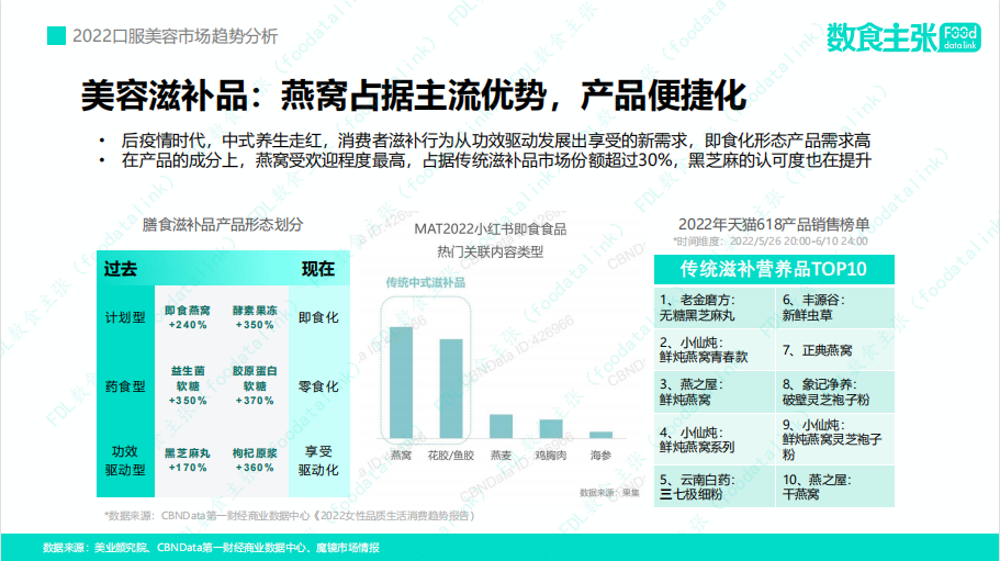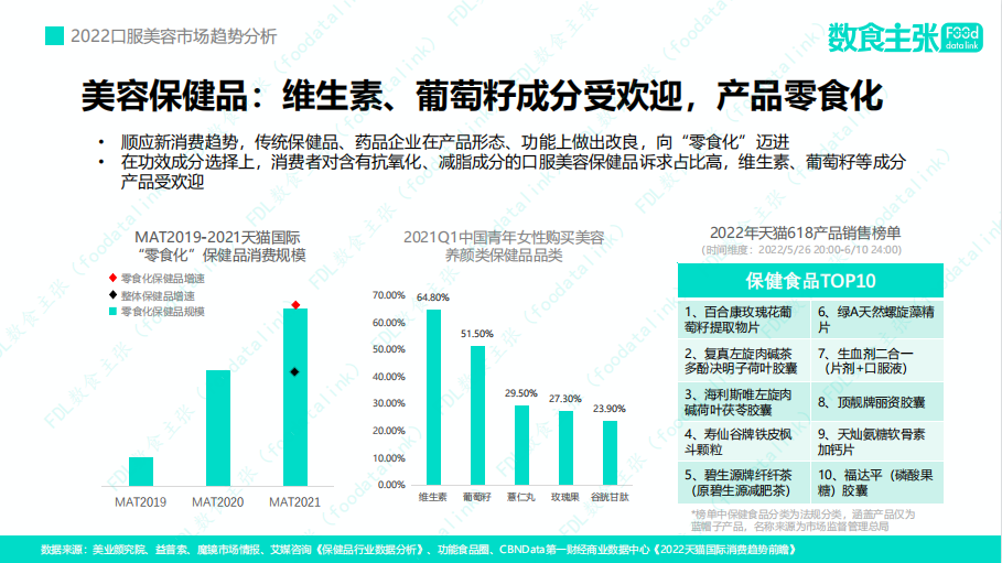 CBNDataX天貓國(guó)際發(fā)布的《2022天貓國(guó)際消費(fèi)趨勢(shì)前瞻》報(bào)告顯示,小紅書上“零食化”養(yǎng)生的討論度及天貓國(guó)際“零食化”保健品的消費(fèi)增長(zhǎng)可觀。而這也是當(dāng)前口服美容產(chǎn)品的一個(gè)發(fā)展趨勢(shì)。