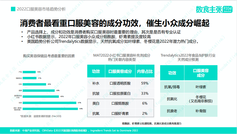 其次,基于成分黨對(duì)口服美容的配方及成分提高了更高的要求,天然小眾成分也得到消費(fèi)者的偏愛,美國(guó)趨勢(shì)分析公司Trendalytics數(shù)據(jù)顯示,天然小眾成分如葉綠素、冬櫻花、補(bǔ)骨脂將是2022年潛力熱門成分。