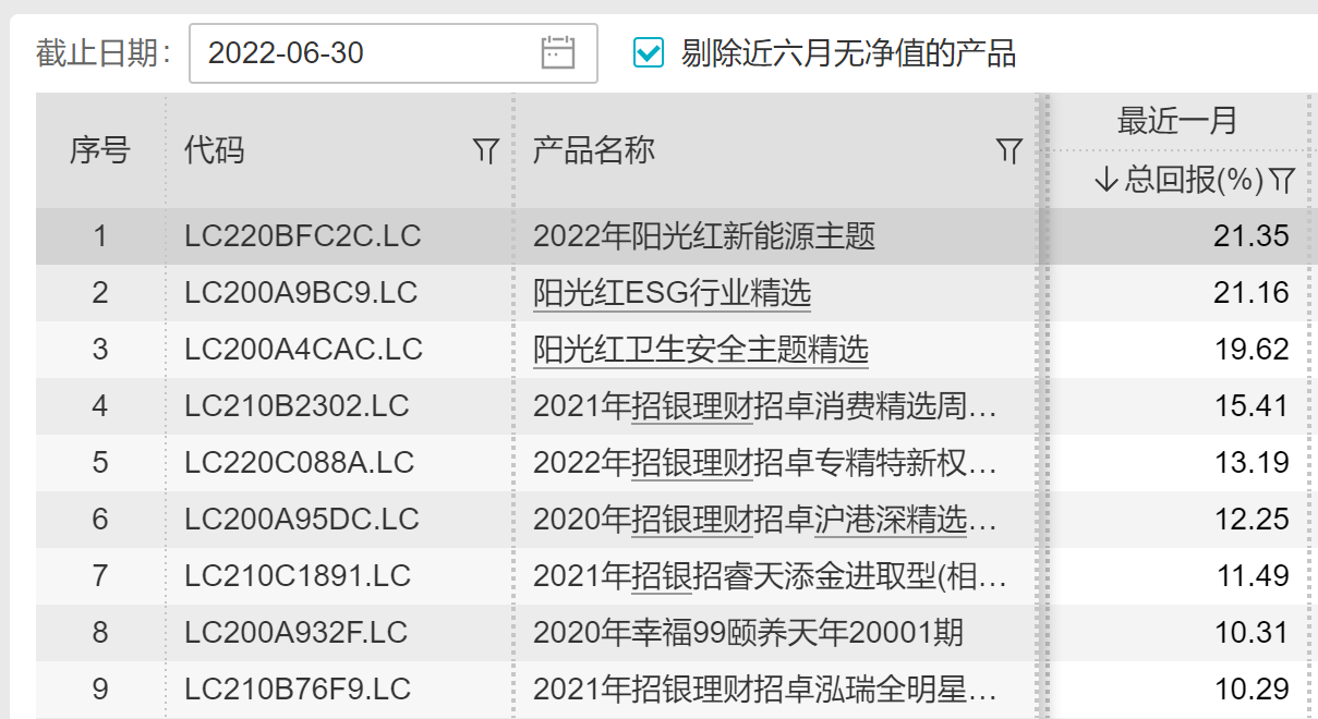 光大理財旗下三只權(quán)益產(chǎn)品“霸榜”。其中,光大理財陽光紅新能源主題產(chǎn)品、陽光紅ESG行業(yè)精選近一月回報率超20%,兩只產(chǎn)品凈值均從水下躍居至水上。另一只產(chǎn)品陽光紅衛(wèi)生精選最新凈值雖只有0.7775,但近一個月收益率也達(dá)到19.62%。