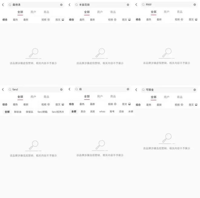 彼時,以品牌名為關鍵詞,在小紅書平臺上搜索這些品牌,相關筆記內(nèi)容無法顯示,頁面僅出現(xiàn)“該品牌涉嫌虛假營銷,相關內(nèi)容不予展示”的提示。