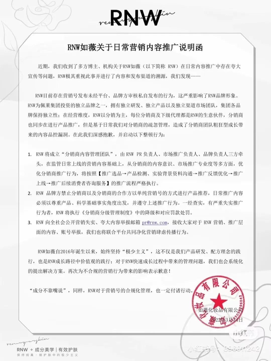 3月一解封,嗅到風頭不對的Rnw品牌就火速發(fā)布公告表示,將成立專業(yè)團隊,對“分銷商(和分銷商的合作方)日常營銷內(nèi)容”進行嚴加管理,公開了舉報郵箱,以免被“豬隊友”連累。