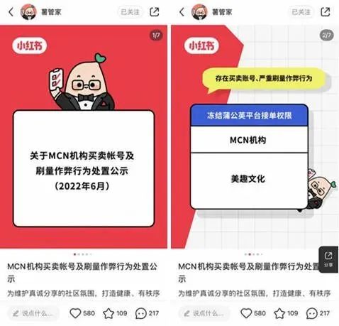 近期(6月20日),小紅書發(fā)布《關于MCN機構買賣賬號及刷量作弊行為公示》,點名提及美趣文化、杭州鄰家網(wǎng)絡、聚微傳媒、熊小嬰等4家MCN機構及其旗下部分作者存在上述作弊行為,并予以凍結(jié)接單權限和禁言甚至是訴訟處理。據(jù)了解,此次被處以凍結(jié)權限的美趣文化還是平臺流水TOP3的頭部MCN。