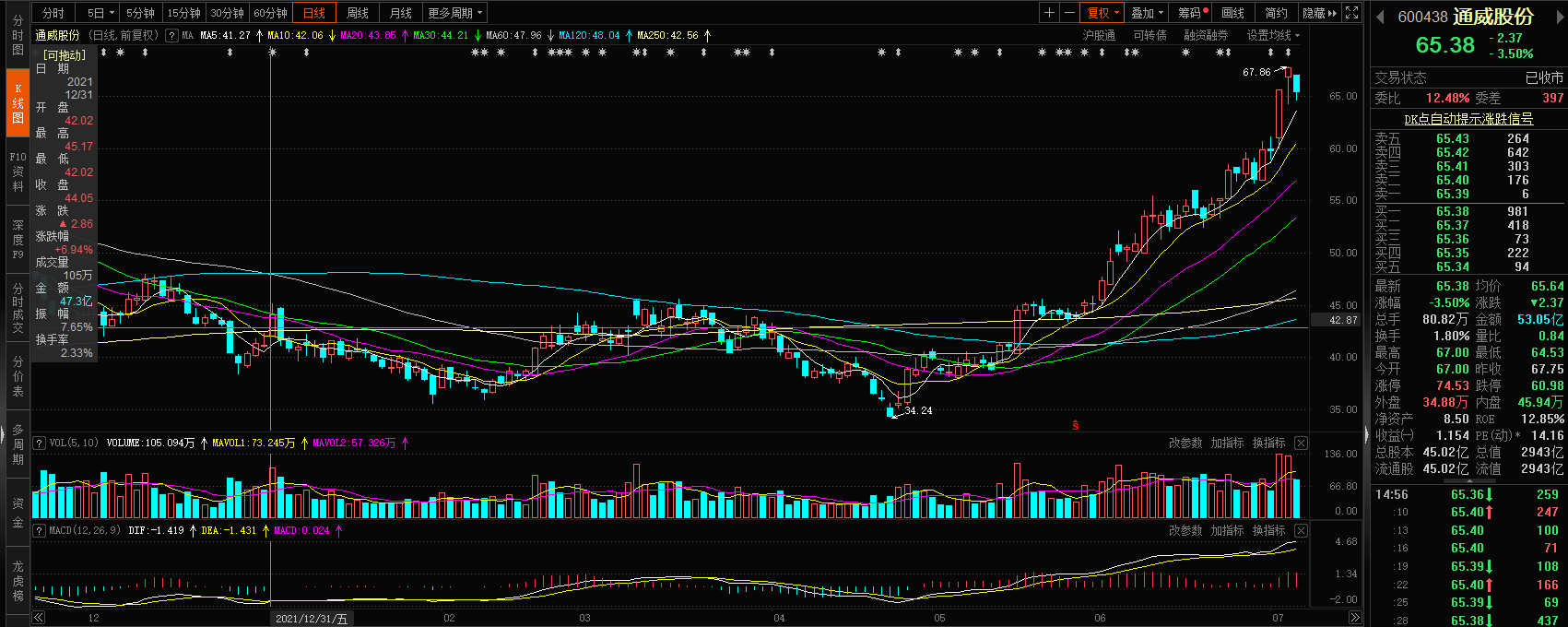 硅料價格創(chuàng)新高,相關(guān)概念股股價也水漲船高。7月5日,通威股份、協(xié)鑫科技、大全能源(688303.SH)、新特能源(01799.HK)均觸及股價高點。
