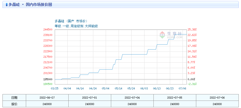 7月6日,中國有色金屬工業(yè)協(xié)會硅業(yè)分會公布最新多晶硅價格。本周國內(nèi)單晶復(fù)投料價格區(qū)間在28.8萬-30萬元/噸,成交均價為29.16萬元/噸,周環(huán)比漲幅為1.85%;單晶致密料價格區(qū)間在28.6萬-29.8萬元/噸,成交均價為28.96萬元/噸,周環(huán)比漲幅為1.9%。