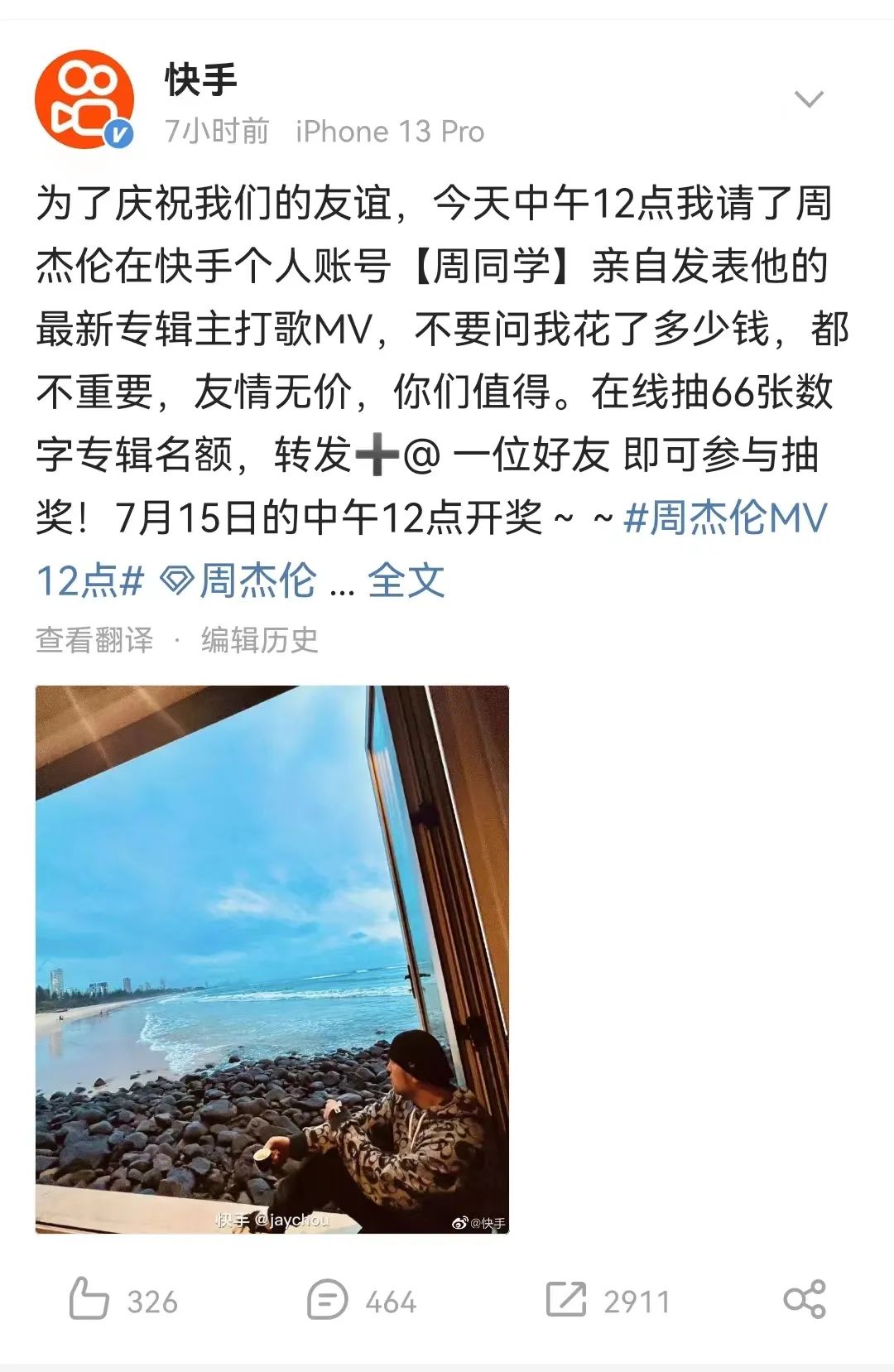 7月6日上午,快手官方微博發(fā)文:“為了慶祝我們的友誼,今天中午12點(diǎn)我請了周杰倫在快手個(gè)人賬號‘周同學(xué)’親自發(fā)表他的最新專輯主打歌MV,不要問我花了多少錢,都不重要,友情無價(jià),你們值得。”