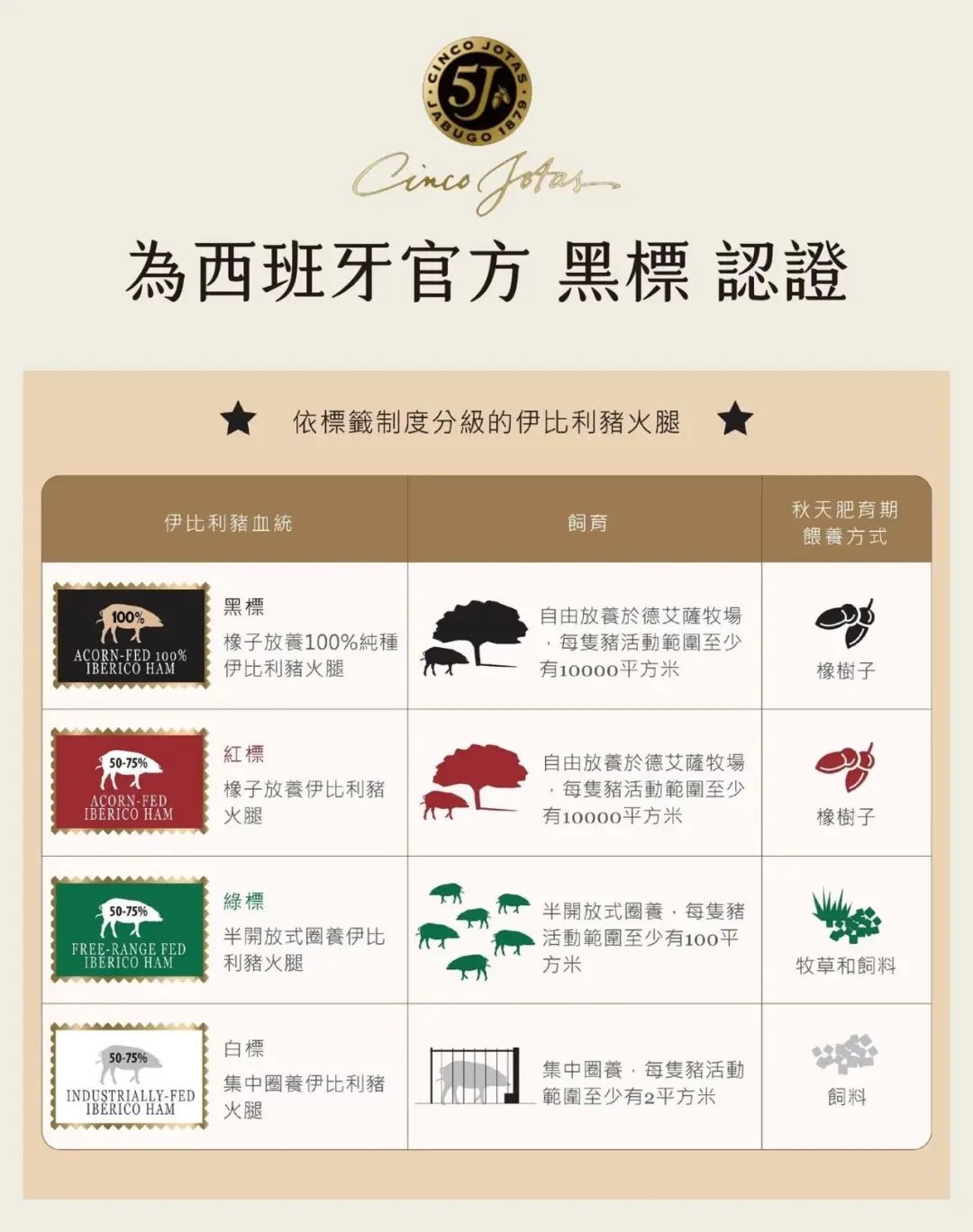 伊比利豬生長(zhǎng)于西班牙南部及西南部,血緣與野豬相近,經(jīng)過(guò)千百年來(lái)的品種選育、地中海獨(dú)特氣候與特殊飼養(yǎng)方式,使其生長(zhǎng)為最尊貴的豬種。素有「世界上最好吃的豬肉」的美稱,是西班牙國(guó)寶級(jí)食材。因此,本地畜牧業(yè)就成為國(guó)家文化體系的關(guān)鍵要素。