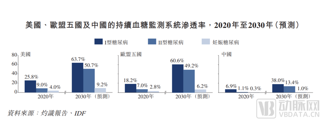 所以雖然1型糖尿病人數(shù)更少,但是滲透率更高,用量更大,市場規(guī)模不同小覷。根據(jù)微泰醫(yī)療的招股書,2020年,美國CGM系統(tǒng)的滲透率在1型糖尿病中為25.8%,在2糖尿病滲透率為9.0%,在妊娠糖尿病中滲透率為4.0%。