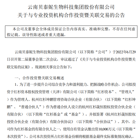 近日,薇諾娜母公司貝泰妮發(fā)布公告稱,公司擬出資1億元投資杭州紅杉晟恒股權(quán)投資合伙企業(yè)(有限合伙)(以下簡稱“紅杉基金”)。