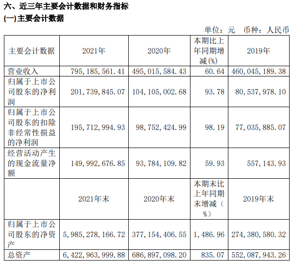 2021年,禾邁股份實(shí)現(xiàn)營(yíng)收7.95億元,同比增長(zhǎng)60.64%;實(shí)現(xiàn)歸屬于上市公司股東的凈利潤(rùn)2.02億元,同比增長(zhǎng)93.78%。今年第一季度,公司實(shí)現(xiàn)營(yíng)收2.29億元,同比增長(zhǎng)95.53%,實(shí)現(xiàn)歸屬于上市公司股東的凈利潤(rùn)0.87億元,同比增長(zhǎng)175.23%。
