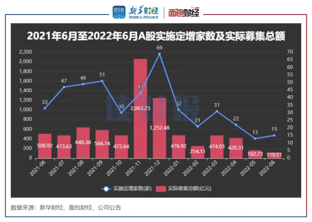 統(tǒng)計(jì)顯示,2022年6月,A股上市公司共計(jì)實(shí)施定增15起,實(shí)際募資總額約119.51億元,定增實(shí)施家數(shù)有所增多,但實(shí)際募集資金較上月明顯下降,較上年同期相比也有較大差距。