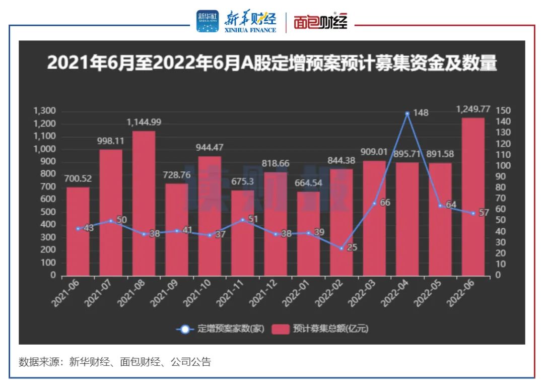 以首次披露預(yù)案公告日統(tǒng)計(jì),2022年6月A股上市公司披露的定增預(yù)案(同一定增預(yù)案下的募資及配套募資合并統(tǒng)計(jì),下同)共計(jì)57起,環(huán)比下降7起;預(yù)計(jì)募資規(guī)模合計(jì)約1249.77億元,與上月相比增長(zhǎng)40.17%。