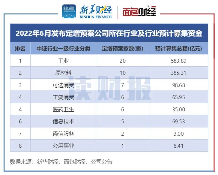 從行業(yè)分布來看,以中證行業(yè)統(tǒng)計(jì),2022年6月,工業(yè)有20家公司發(fā)布定增預(yù)案,數(shù)量排在各行業(yè)之首;原材料行業(yè)排在第二位,有10家公司發(fā)布定增預(yù)案;可選消費(fèi)行業(yè)有7家發(fā)布定增預(yù)案,位列第三位。