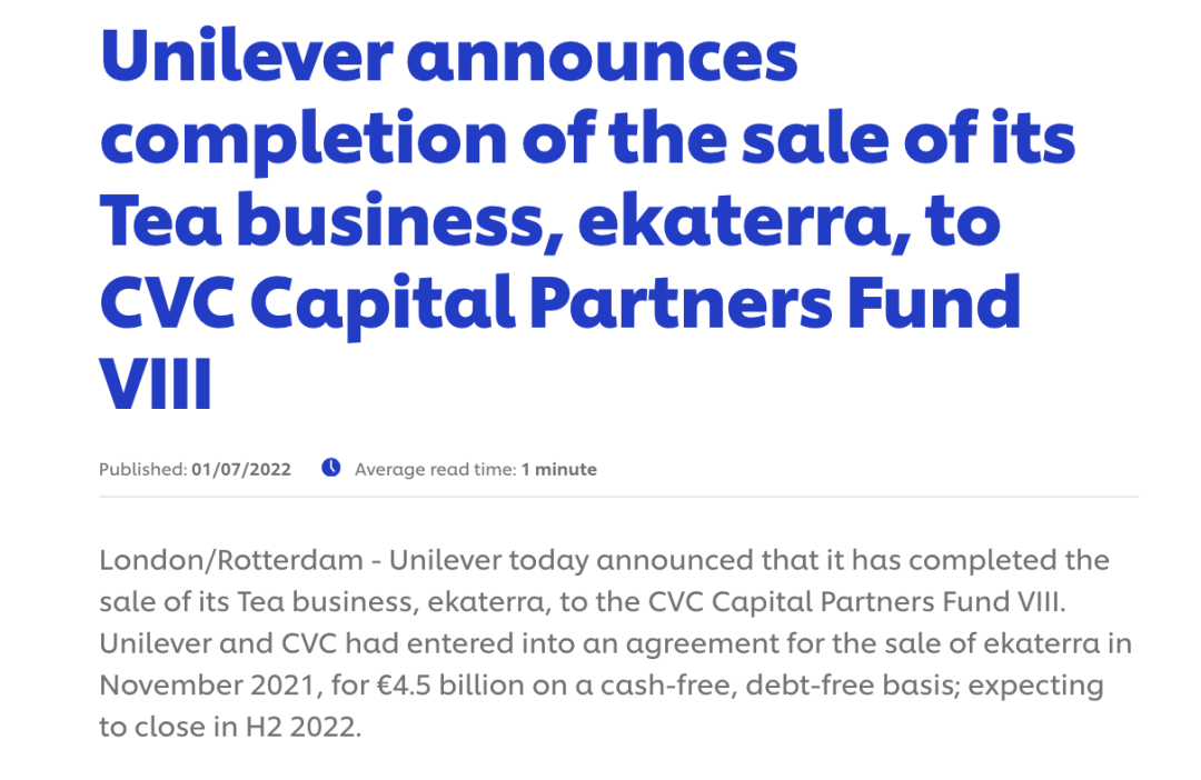 聯(lián)合利華在上周五發(fā)布的公告中表示,此前,聯(lián)合利華和CVC已于2021年11月簽訂了出售ekaterra的協(xié)議,在無現(xiàn)金、無債務(wù)的基礎(chǔ)上以45億歐元(約合人民幣314億元)的價(jià)格出售;預(yù)計(jì)于2022年下半年完成。