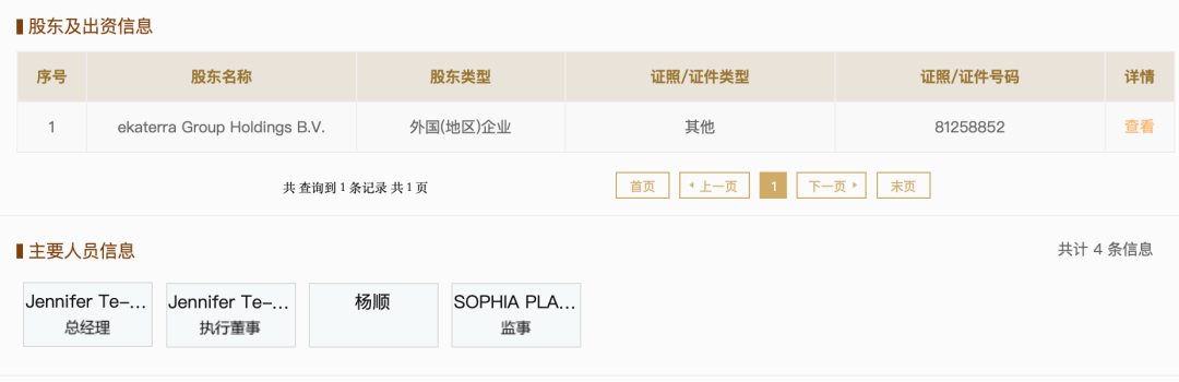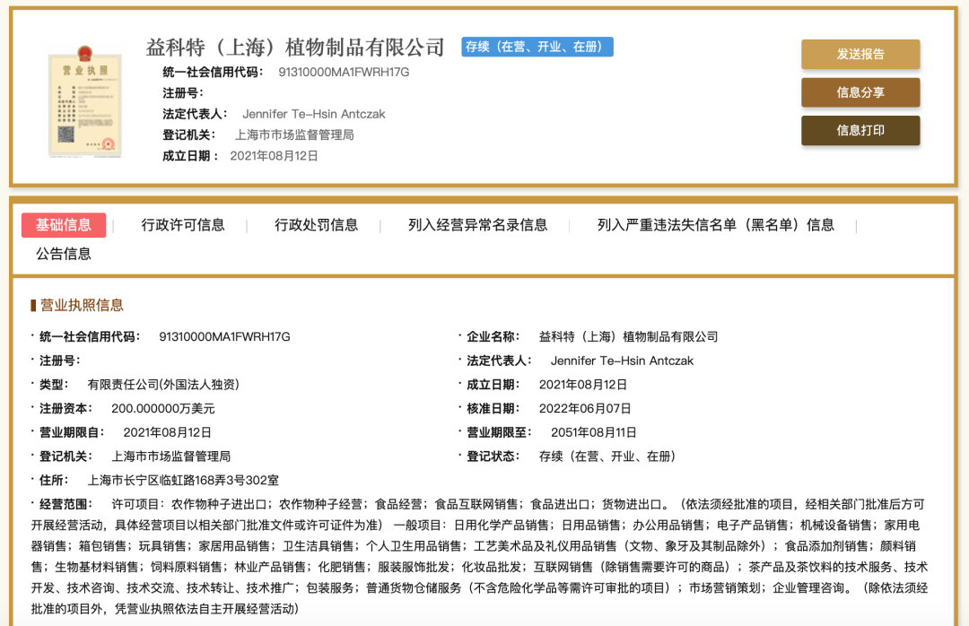 小食代翻查的工商資料顯示,益科特(上海)植物制品有限公司成立于2021年8月12日,注冊(cè)資本為200萬美元,核準(zhǔn)日期為2022年6月7日,由外資企業(yè)ekaterra Group Holdings B.V.持有,經(jīng)營范圍包括農(nóng)作物種子進(jìn)出口、農(nóng)作物種子經(jīng)營、食品經(jīng)營、食品互聯(lián)網(wǎng)銷售、食品進(jìn)出口、貨物進(jìn)出口等。該公司的法定代表人、總經(jīng)理、執(zhí)行董事為Jennifer Te-Hsin Antczak。