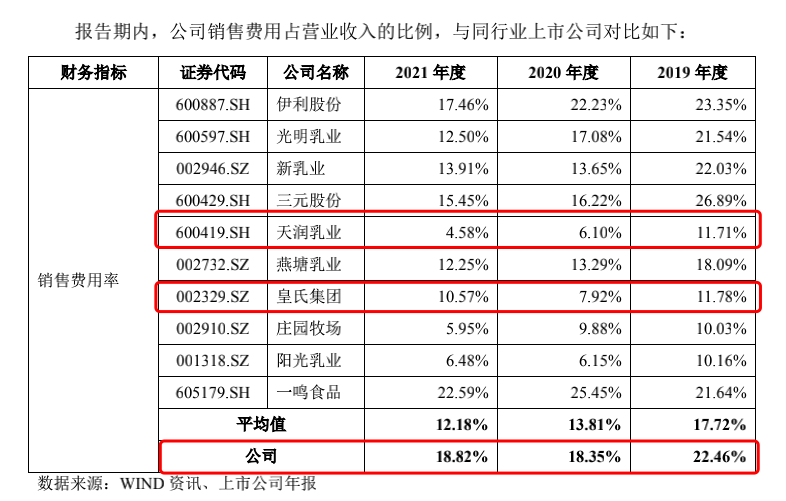 2019年到2021年,認(rèn)養(yǎng)一頭牛銷售費(fèi)用分別為1.94億、3.03億、4.83億,銷售費(fèi)用率分別為22.46%、18.35%、18.82%;同期,A股上市乳企的平均銷售費(fèi)用率為17.72%、13.81%、12.18%。