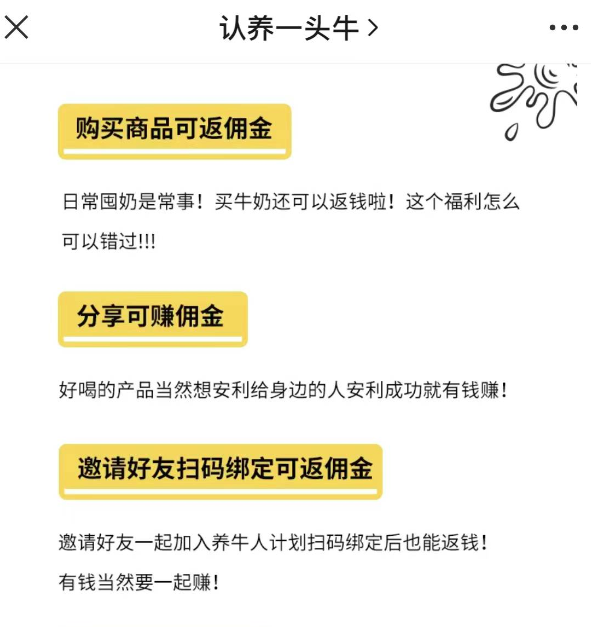 認(rèn)養(yǎng)一頭牛另一個(gè)爭(zhēng)議點(diǎn)是2020年推出的“養(yǎng)牛人招募計(jì)劃”,具體包括“購(gòu)買商品可返傭金”“分享可賺傭金”“邀請(qǐng)好友掃碼綁定可返傭金”等活動(dòng)。