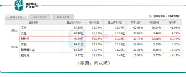 分業(yè)務(wù)來看,以六氟磷酸鋰為核心的新材料業(yè)務(wù)是公司營(yíng)收、盈利的主力軍,2021年所占比重分別為52.18%、82.68%。