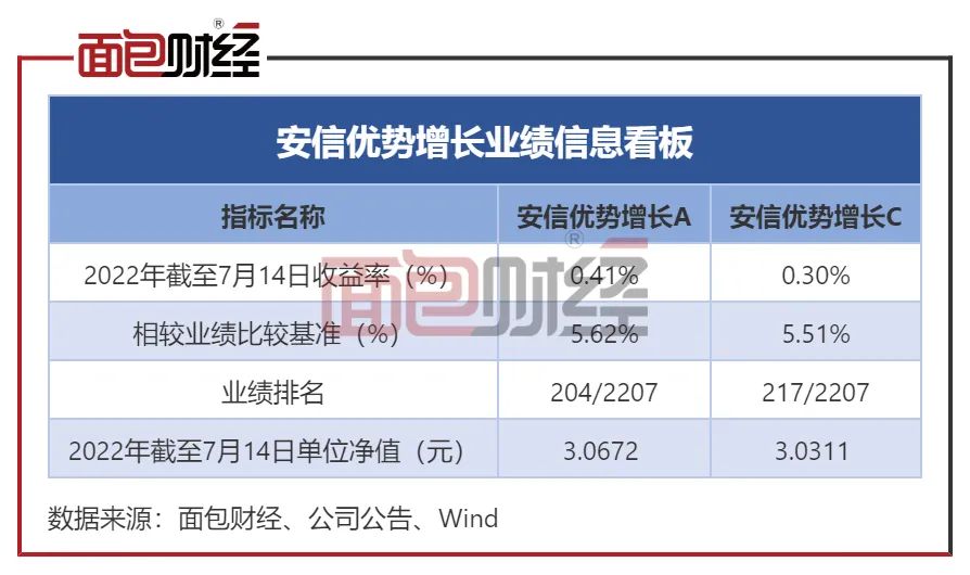 安信優(yōu)勢增長包含A/C類基金份額,兩類份額較為接近。截至2022年7月14日,安信優(yōu)勢增長A的年內(nèi)收益率為0.41%,跑贏業(yè)績基準(zhǔn)超過五個百分點(diǎn),同類排名204/2207,整體表現(xiàn)較為優(yōu)秀。