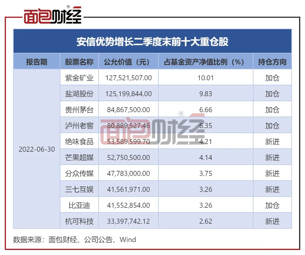 具體持倉上,基金進(jìn)一步增持紫金礦業(yè)、鹽湖股份、瀘州老窖等股票。絕味食品、芒果超媒、分眾傳媒、三七互娛、杭可科技新晉為基金前十大重倉股,而金地集團(tuán)、兗礦能源、招商蛇口、保利發(fā)展、五糧液消失在基金前十大重倉股名單。