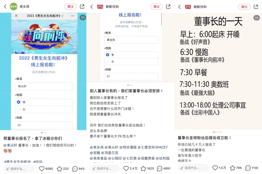 作為在微博和小紅書上“皮”出名的官號(hào),給董事長(zhǎng)挖坑這件事,老鄉(xiāng)雞必然是一馬當(dāng)先,61歲的董事長(zhǎng)也得去闖(落)關(guān)(水)。而受到啟發(fā)的其他官號(hào)也紛紛行動(dòng)起來,給董事長(zhǎng)報(bào)上了名。像盼盼不但給自家董事長(zhǎng)報(bào)名,還要攛掇其他品牌一起上,甚至還給董事長(zhǎng)起后援會(huì)名字,監(jiān)督老板健身做日程表。